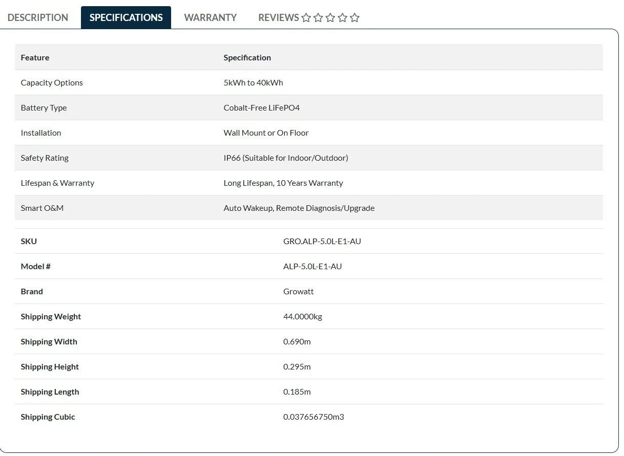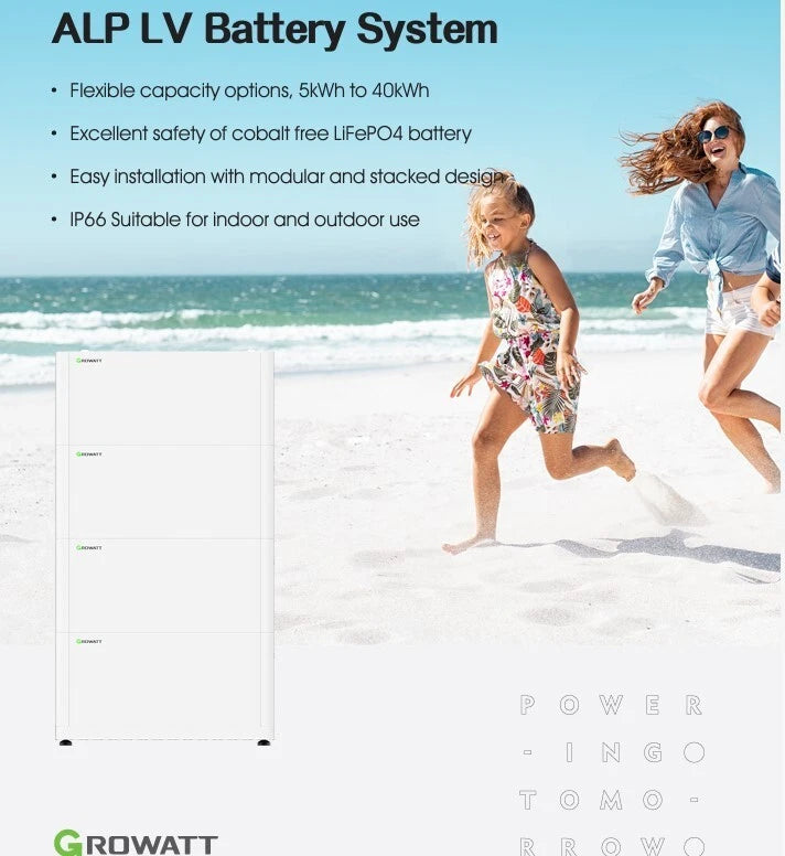 GROWATT ALP 5.0L E1 AU Series Battery System. Offering flexible 5-40kWh capacity, cobalt-free safety, easy install, and IP66 rating for indoor/outdoor use. Long lifespan with a 10-year warranty.