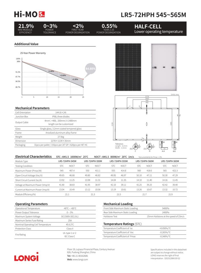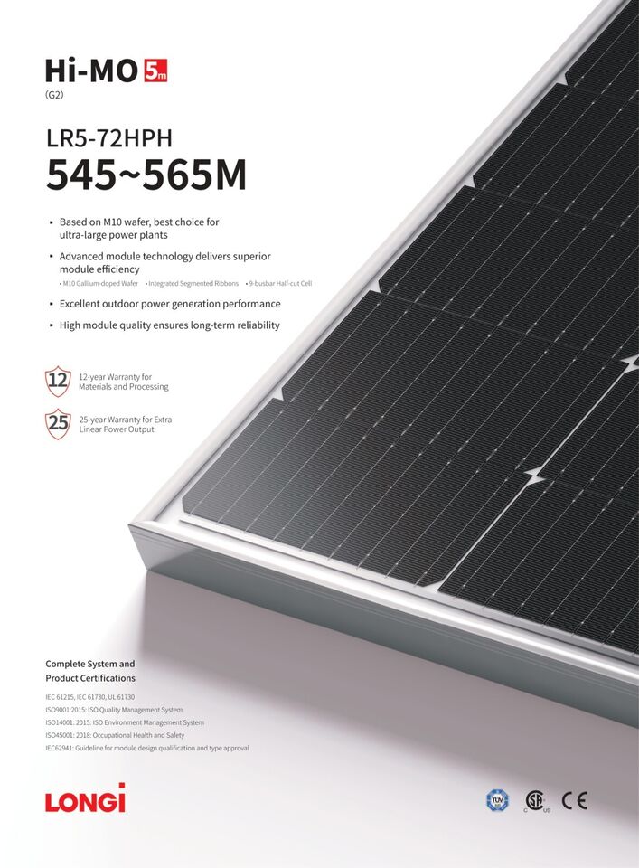 LONGI HI-MO 5M Series 555Watt 144 Cell LR5-72HPH-560M Solar Panel